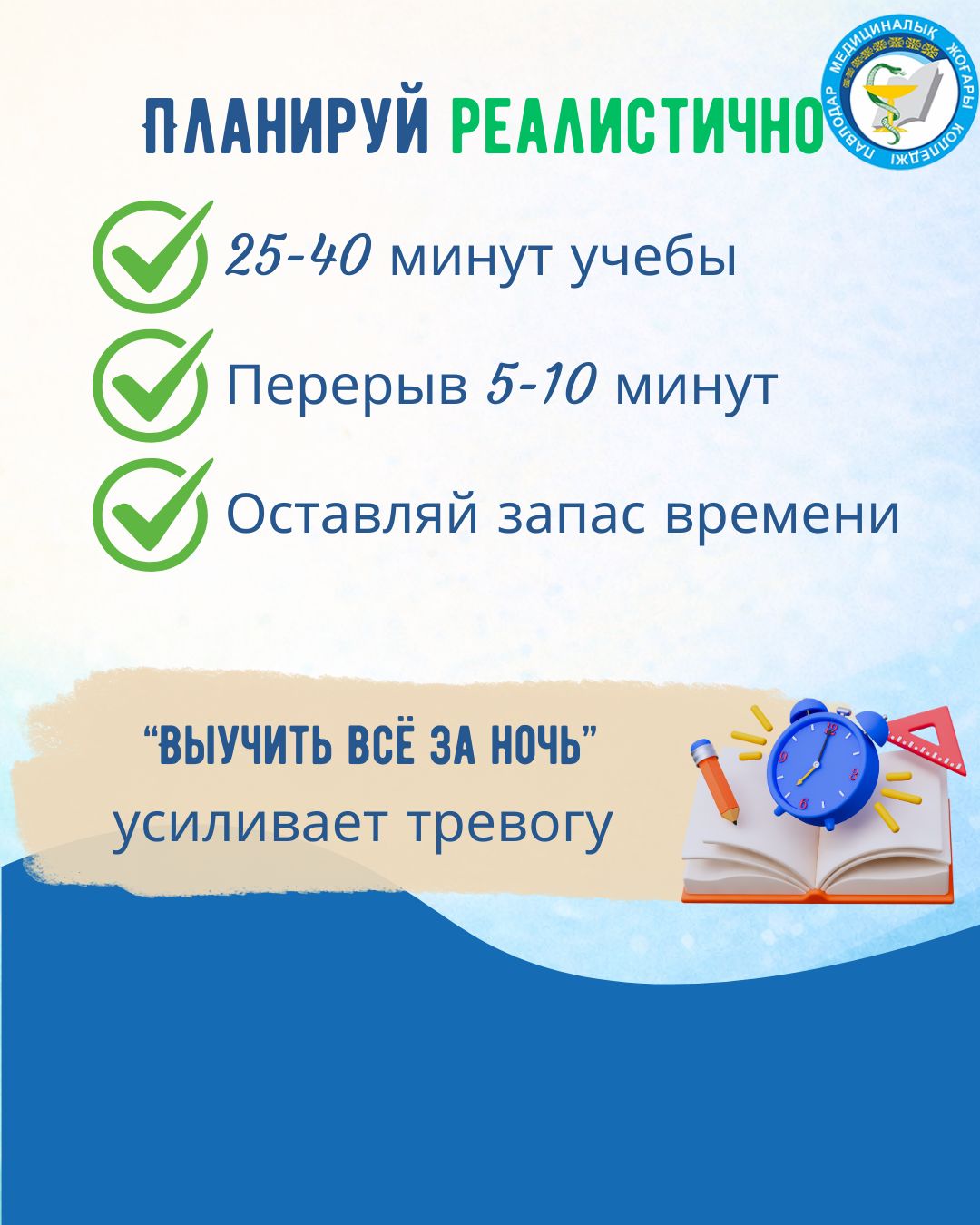❌ Не планируй «выучить всё за ночь» — это усиливает тревогу.
