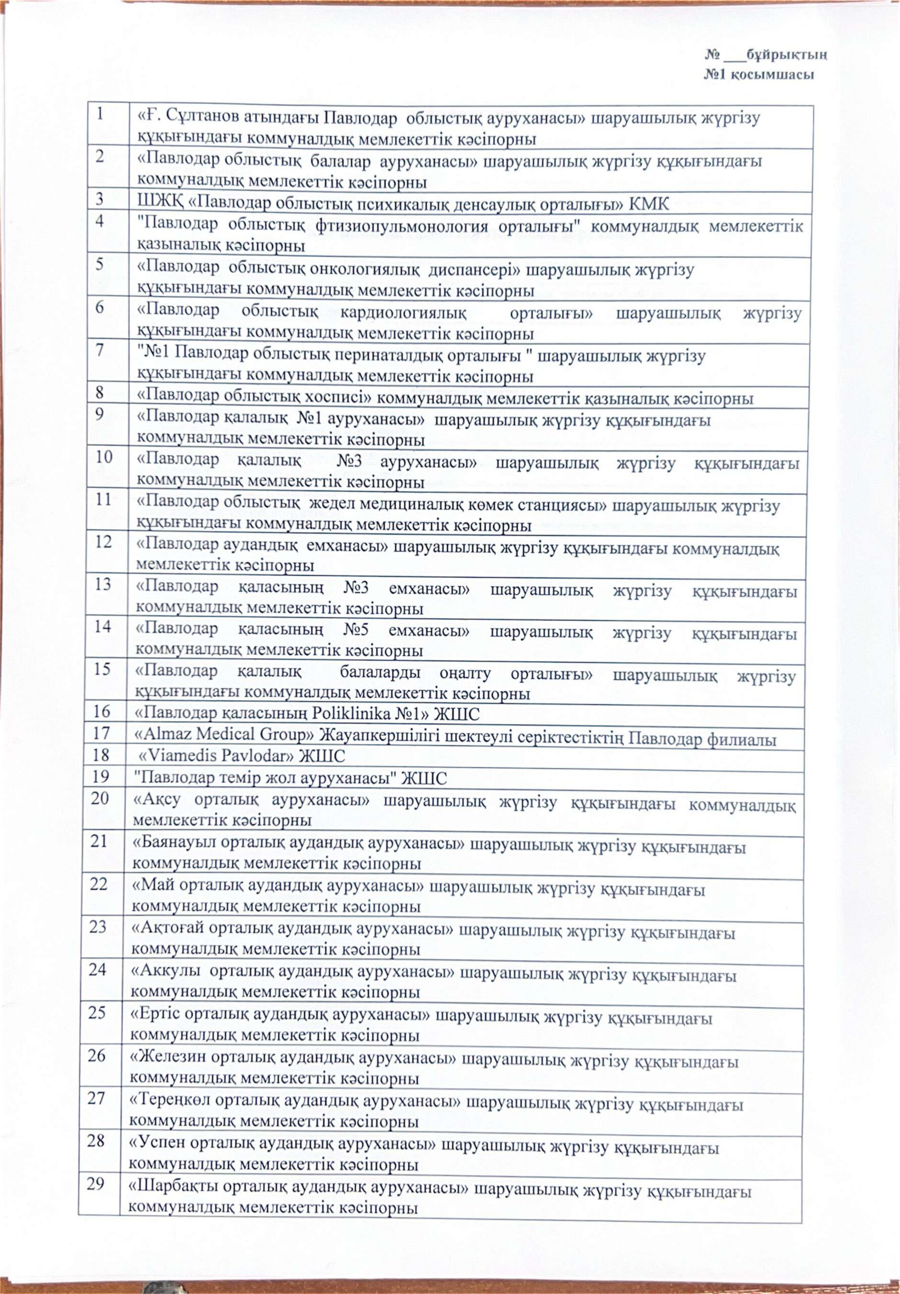 — «Мейіргер ісі» мамандығы бойынша: — 3 адам: «Павлодар облысының Хосписі» ШЖҚ КМК-2; «Ғ. Сұлтанов атындағы Павлодар облыстық ауруханасы» ШЖҚ-ғы КМК.