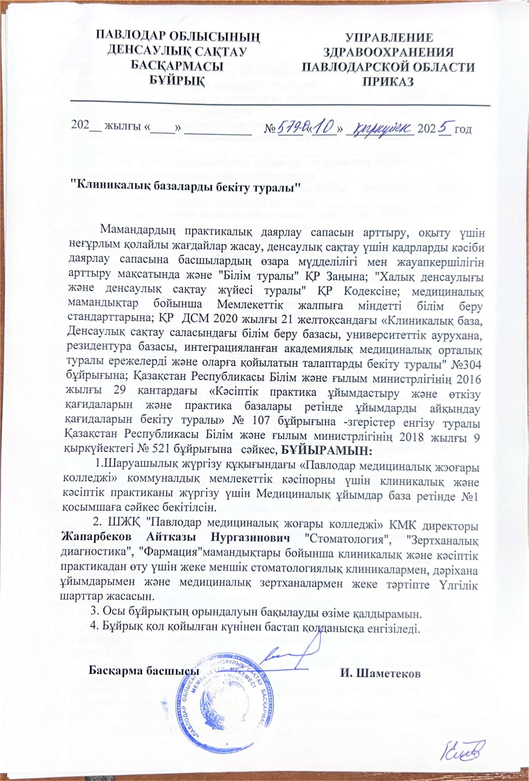Мамандарды сапалы даярлау мақсатында Медицина колледжі мен қала мен облыстың медициналық (дәріхана) ұйымдары арасында өзара ынтымақтастық туралы шарттар жасалды. Павлодар медициналық колледжінің 2024-2025 оқу жылына арналған клиникалық базасы ретінде 40 медициналық ұйым, оның ішінде зертханалар, дәріхана және стоматологиялық ұйымдар анықталды, 19 медициналық ұйыммен дуальды оқытуды енгізу шеңберінде 3 тарап шарттары жасалды