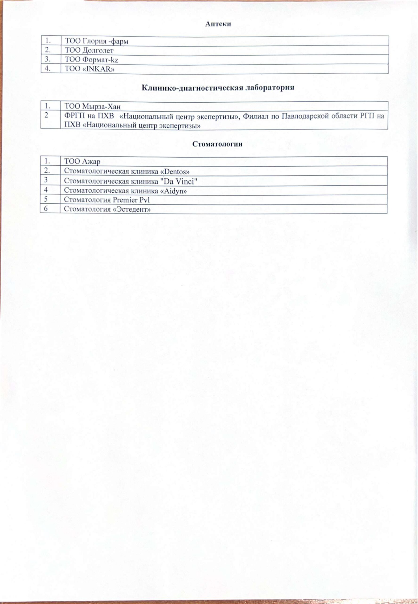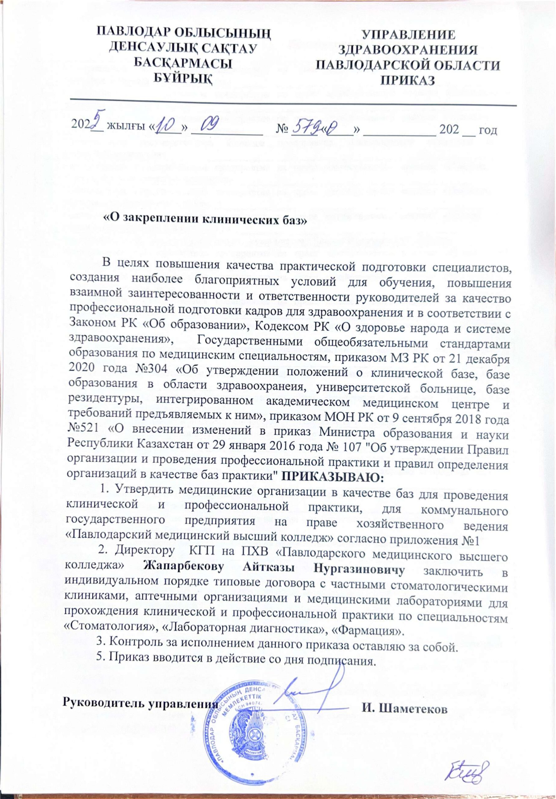 В целях качественной подготовки специалистов заключены договоры о взаимном сотрудничестве между медицинским колледжем и медицинскими (аптечными) организациями города и области. В качестве клинических баз Павлодарского медицинского колледжа на 2025-2026 учебный год определены 40 медицинских организации, в том числе лаборатории, аптечные и стоматологические организации, с 19 медицинскими организациями заключены 3-х сторонние договора в рамках внедрения дуального обучения